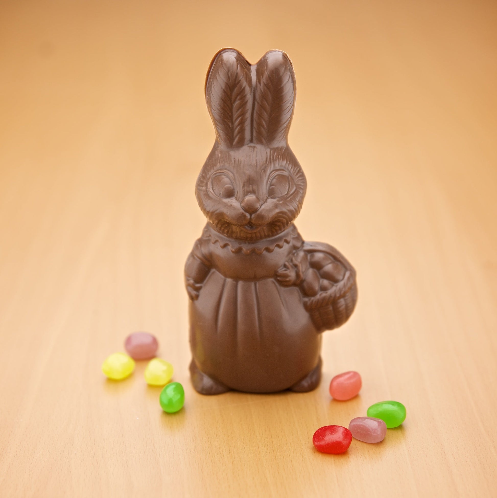A cute little girl just hopped into town! Girl Bunny, made of solid milk chocolate, is an irresistible treat that's sure to delight. Get yours before she hops away! (Did someone say delicious?) 4 oz of solid milk chocolate.