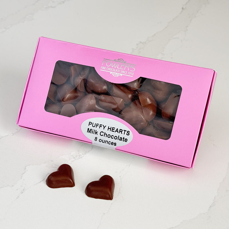 8 ounces of love! Available in milk chocolate. Puffy hearts show your sweet heart just how much you care.